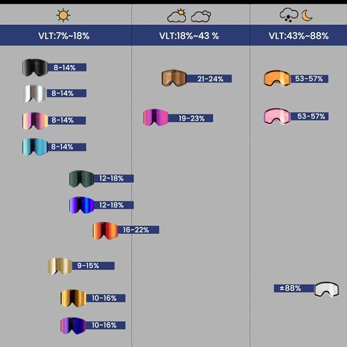 • 【MAGNETIC LENS TECHNOLOGY】: The ski goggles lenses are removable. You can change to different VLT lenses to filter different levels of UV light. The lenses are held in place by magnetized points for easy replacement. This Ski Glasses is double-layer Lens design. The snowboarding goggles outer lens are made of PC material, which make it lightweight,heat resistant and high vision. Anti-fog inner lens provide excellent clarity.