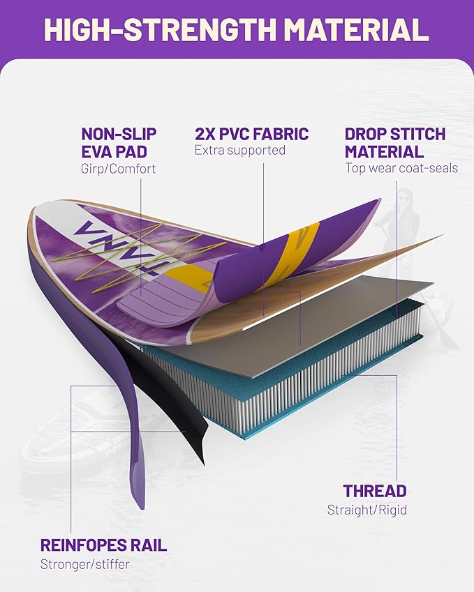 - 【Durable & sturdy】Crafted with high-quality materials, our paddle board guarantees durability and stability. Whether you're on a lake, river, or beach, you can confidently navigate the water, knowing that your board can withstand the adventure. Even on slightly choppy waters, you'll experience the remarkable stability of this board, providing you with peace of mind and confidence during your expeditions.