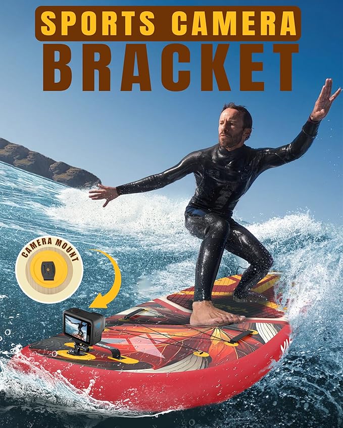 - Camera Mount &5 handles:The front end of the paddleboard is equipped with a multi-functional camera mount, and the five handles—front, rear, and middle—provide convenient lifting,whether you're loading it into your vehicle, moving it around, or handling it solo or with a partner