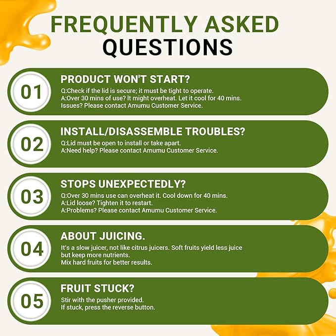 - [Helpful Tips for Smooth Operation]: For best results, make sure to: 1. Keep the lid open when assembling or removing the chute. 2.Align the locking markers when attaching the juice cup. 3.If there's a blockage, switch to “REV” for 3–5 seconds. Still need help? Our support team is always here for you!