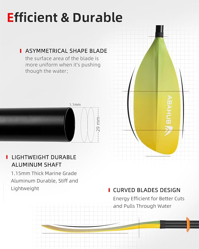 • 【LIGHTWEIGHT AND DURABLE 】The aluminum alloy shaft is known for its strength and ability to withstand the wear and tear of frequent use. In addition to its durability, the aluminum alloy shaft also offers better performance and more efficient paddling. PP blades are lightweight and indestructible blades offer flexibility and efficiency, making it easier for paddlers to navigate through the water with ease.