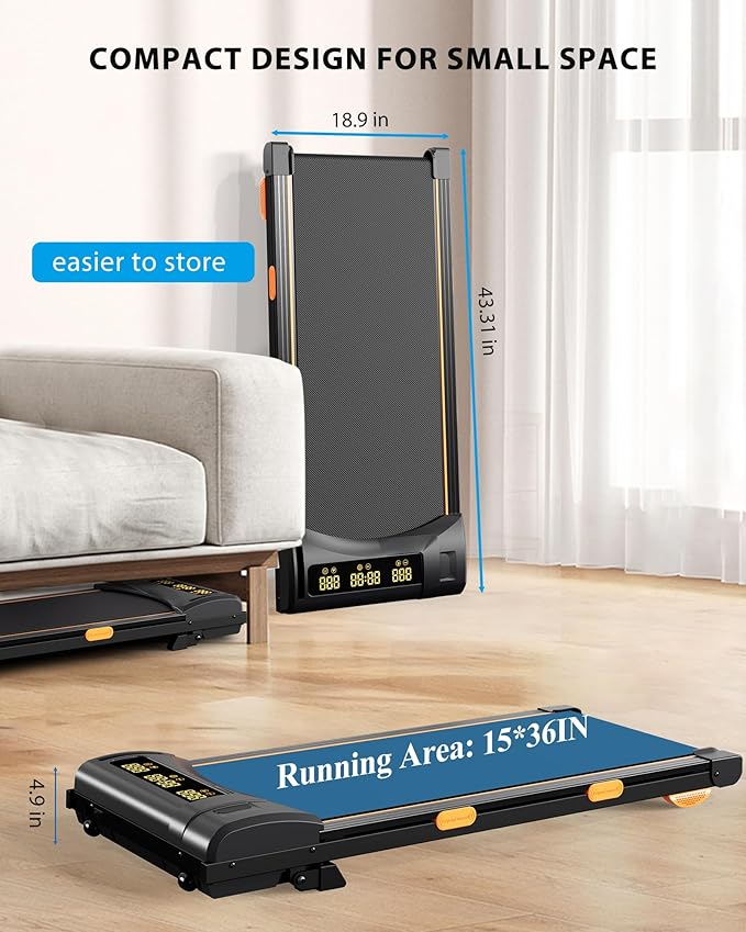 - 【Compact Design Fits Any Space】This portable treadmill(Running Belt Size: 14.96*36.22in) is designed for people under 5.6ft. It features built-in wheels, and its compact and lightweight design allows for easy storage in small apartments or confined spaces, such as a sofa, bed, or in a corner to maximize space. *Not suitable for people over 5.6ft