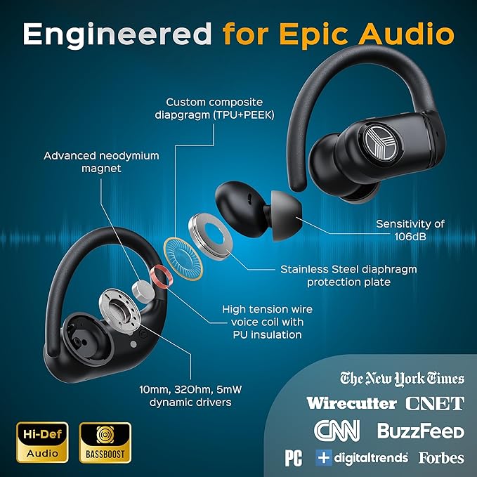 - Sweat With No Worries - Sweatproof earbuds with ear hooks are IPX5 water-resistant, protecting against sweating and splashes – ideal gym headphones for women who run, lift, or train in any weather.