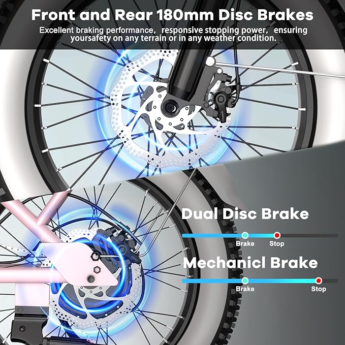 - 【Suspension System & Dual Disc Brakes】: High-strength front suspension fork and seat suspension absorbers, effectively reduced the vibration of the frame, the front and rear brake system with power-off function, offers an easy brake within 1 second, effective braking in any terrain or in any weather condition, stop the e-bike quickly and smoothly, offer you safer and comfortable riding experience.