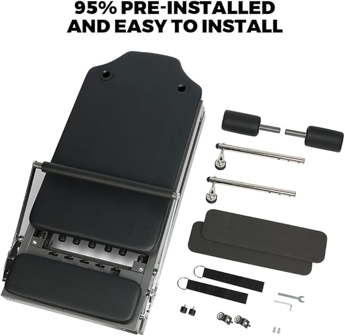 - 95% PRE-INSTALLEDAND EASYTOINSTALL: This Pilates Reformer 95% comes pre-assembled and takes you only 5-10 minutes to set up! It's friendly to women. The Pilates built-in wheels also make it easy to move around, and you can fold it up and put it in a corner when not in use.