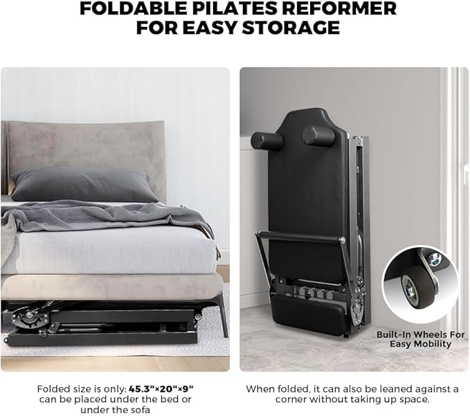 - Your Home Pilates Solution - Start your fitness journey at home with this versatile, foldable pilates reformer, perfect for beginners and advanced users alike. No need to pay expensive Pilates studio membership fees.The Pilates Reformer features a collapsible design and measures only 45.3" * 20" * 9.1" when folded. for any spaces, and equipped with wheels allow for easy moving.