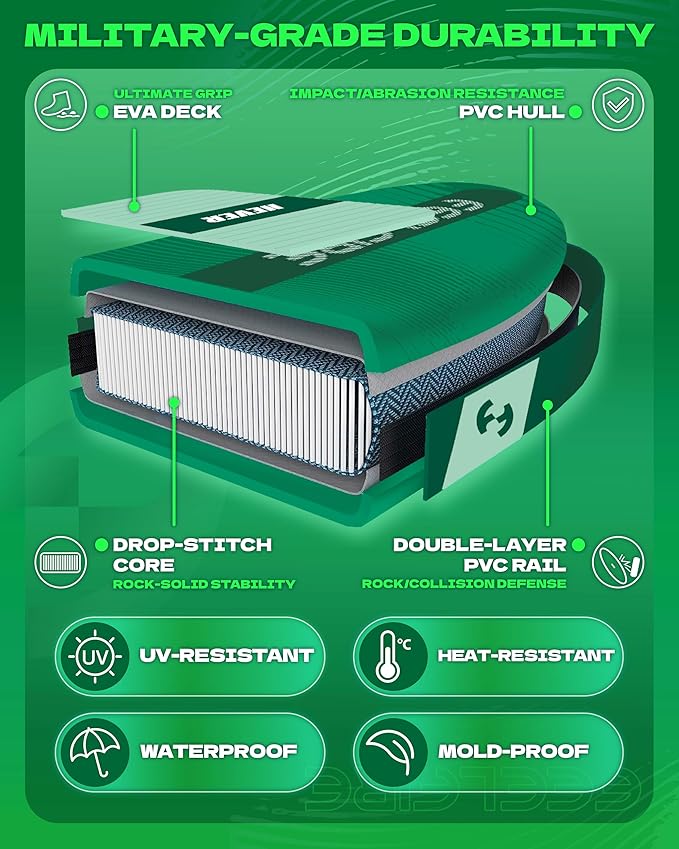 - ใ๐ง๐ฟ๐ถ๐ฝ๐น๐ฒ-๐๐ฎ๐๐ฒ๐ฟ ๐ฆ๐๐ฟ๐ถ๐ป๐ด๐ฒ๐ฟ๐ & ๐๐ผ๐๐ฏ๐น๐ฒ ๐ฆ๐ถ๐ฑ๐ฒ ๐ฅ๐ฎ๐ถ๐น๐ for Ultimate Durabilityใ Feelfire SUP features triple-layer stringers and double side rails for superior performance. These elements prevent bending or deformation, ensuring balance even with multiple passengers. Withstanding high inflation pressures of 12-15 psi, the SUP maintains its shape during light rock impacts and the occasional brush with sandy beaches, so you can focus on enjoying your time on the water.