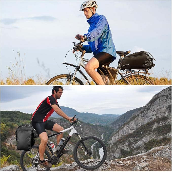 - 【Larger 20L Capacity & Smart Organization】 - The overall capacity of the Venforest Evolved version Rear Bike Rack Bag reaches 20L. The top strap can hold a kettle, and the large space on the inside can easily store phones, kettles, clothes, and other tools. There is also a mesh pocket that can hold urgently needed items, so you don't need to search in the bag for a long time. Two Both sides can be opened to become two larger capacity expansion pockets, providing more storage space to support a pleasant cycling journey.