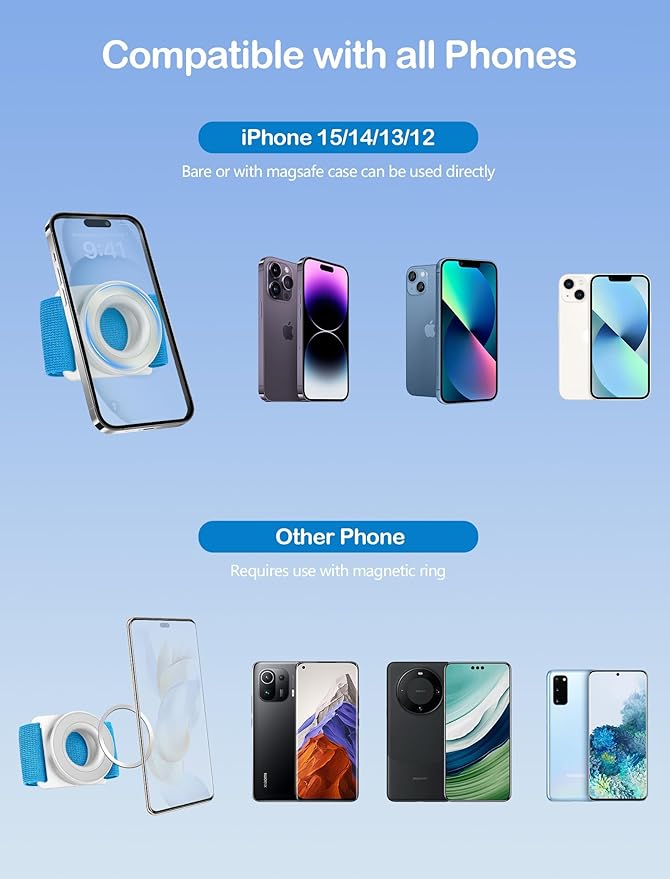 - [Optimal Magnetic Balance]: The magnetic wrist phone holder utilizes 20 N52 grade neodymium magnets with upgraded magnetic force, which ensures that your phone stays firmly in place. And it's easy and effortless to pick up and put down during use!This would make an awesome new year's gift for your exercise-loving self or family and friends!