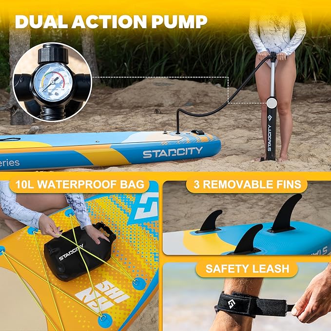 - 【Exclusive accessories, quality assurance】The STARCITY complete paddle board set includes an inflatable paddle board, a pump, a three-piece floating paddle (crafted from special materials that allow it to float in water and make it suitable for various aquatic environments), a safety leash, a portable backpack, and three removable fins, along with all necessary accessories.