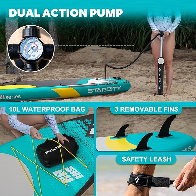 - 【Exclusive accessories, quality assurance】The STARCITY complete paddle board set includes an inflatable paddle board, a pump, a three-piece floating paddle (crafted from special materials that allow it to float in water and make it suitable for various aquatic environments), a safety leash,a portable backpack, and three removable fins, along with all necessary accessories.
