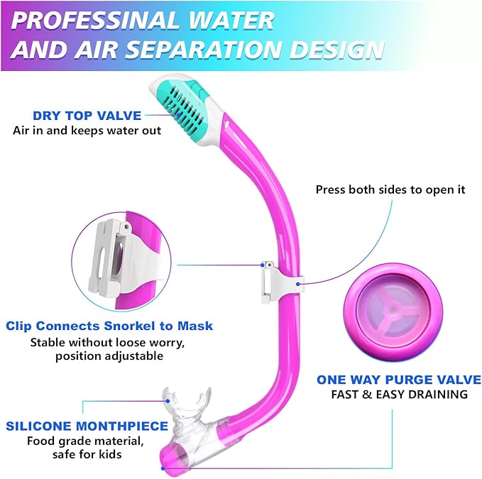 • 【Thickened Tempered Glass Lens】- The Diving Goggles are made of 4.0mm HD tempered glass lens, which is much more thicker and durable than other 3.2mm lens. It is impact resistant and explosion-proof, clear and safe. Dry-top snorkels have a mechanism that prevents water from entering the tube when submerged, making them a good choice for beginners