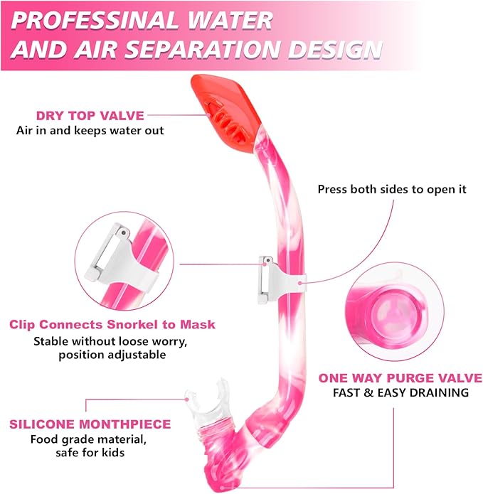 - 【Thickened Tempered Glass Lens】- The Diving Goggles are made of 4.0mm HD tempered glass lens, which is much more thicker and durable than other 3.2mm lens. It is impact resistant and explosion-proof, clear and safe. Dry-top snorkels have a mechanism that prevents water from entering the tube when submerged, making them a good choice for beginners