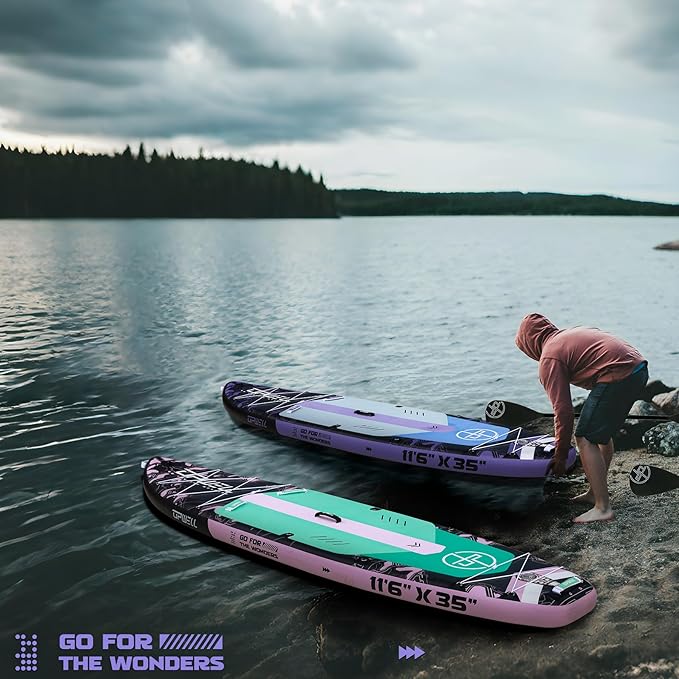 - 【PROFESSIONAL SUP DESIGN】UPWELL inflatable stand up paddle board is 11’6”x 35”x 6”. It's weight capacity up to around 500lbs and 35 inch extra wide design ensures higher stability and flexibility. Our unique design suitable for all beginners and all skill levels to explore and enjoy themselves in different water areas, such as ocean, lake and river, withstand both fresh and salt water. This is an all-around board that can be used for surfing, fishing, touring, yoga and family fun.