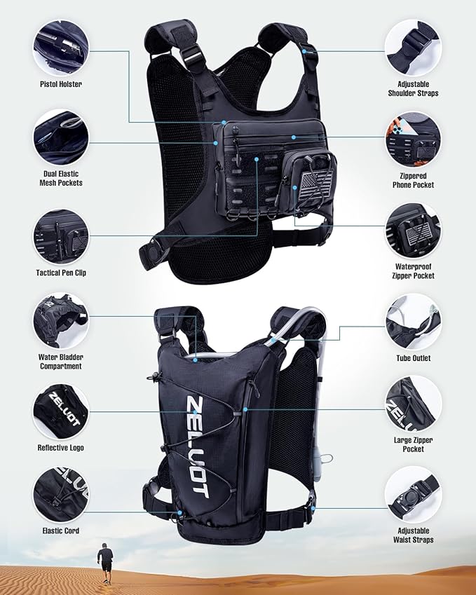 - Plenty of Storage – This chest bag features 3 waterproof zippered front pockets to securely hold essentials like your phone, keys, and energy gels. A detachable, bounce-free utility holder ensures secure storage for small tactical gear, while the emergency pen slot keeps emergency gadgets within easy reach. Two large back pockets fit a water bladder, towel, or extra clothing.