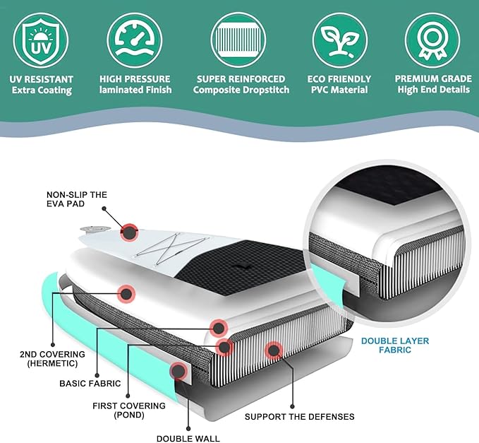- 🛡️Military-Grade Durability & Safety: Built with 0.9mm reinforced PVC and dual-layer V-drop stitch technology, the blow up paddle board withstands sharp impacts and UV exposure. The 4mm cross-vertical EVA deck delivers exceptional anti-slip performance, even during high-intensity movements. Rated for 450 lbs, it retains structural integrity under heavy loads, making it ideal for fishing, yoga, or multi-hour expeditions.
