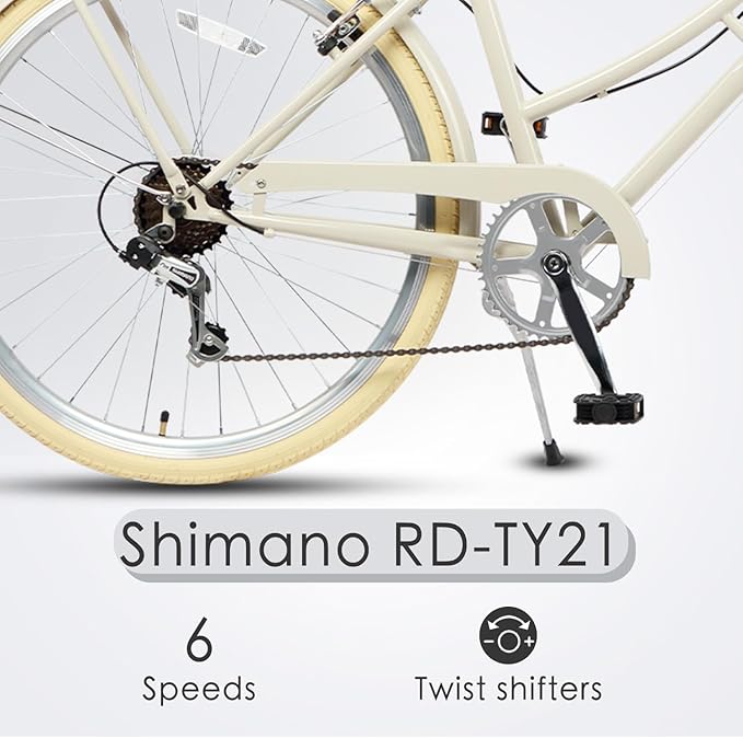 - 🚴♀️【Women-Centric Ergonomic Design】Crafted for female proportions: A low-step high-carbon steel frame enables easy mounting, while the swept-back handlebars promote upright posture (reducing back strain). The brown synthetic leather saddle with shock-absorbing springs combines vintage aesthetics with modern comfort.