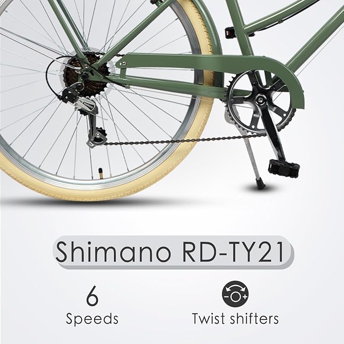 - 🚴♀️【Women-Centric Ergonomic Design】Crafted for female proportions: A low-step high-carbon steel frame enables easy mounting, while the swept-back handlebars promote upright posture (reducing back strain). The brown synthetic leather saddle with shock-absorbing springs combines vintage aesthetics with modern comfort.