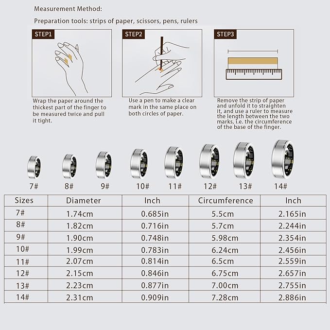 - 【Select the Right Size】: Measure your finger circumference using our size guide to ensure the best fit. The Anarow smart health ring is available in 8 sizes. If your measurement is between sizes, we recommend choosing the larger size for added comfort and accurate sensor performance