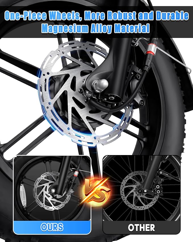 - 【𝐅𝐮𝐥𝐥 𝐒𝐮𝐬𝐩𝐞𝐧𝐬𝐢𝐨𝐧 𝐒𝐲𝐬𝐭𝐞𝐦】Featuring 4-piston 203mm hydraulic disc brakes, this e-bike offers superior stopping power, ensuring safety and control at high speeds. Paired with a lockable hydraulic suspension and an aluminum rear shock absorber, it’s built to absorb shocks and smooth out bumps, providing a more comfortable ride.