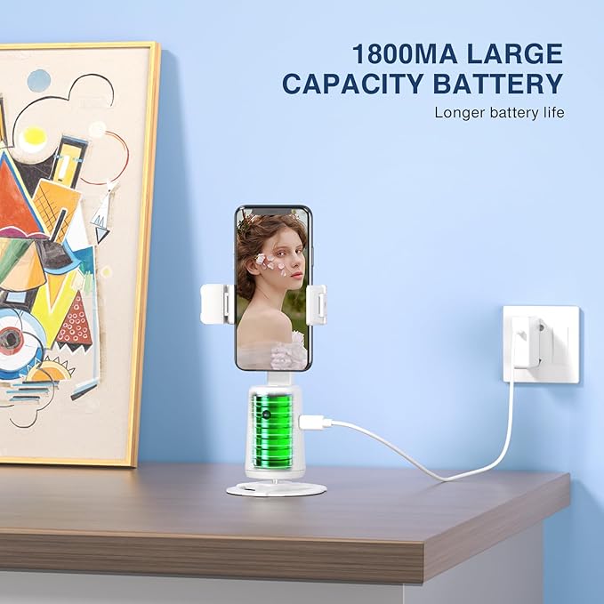 - 【Built-in Rechargeable Battery】The smart tracking phone holder is equipped with a built-in rechargeable 1800mAh battery and USB charging port. Once fully charged, it can last up to 6-8 hours of use. The red charging indicator light lights up during charging and turns off after charging is completed.