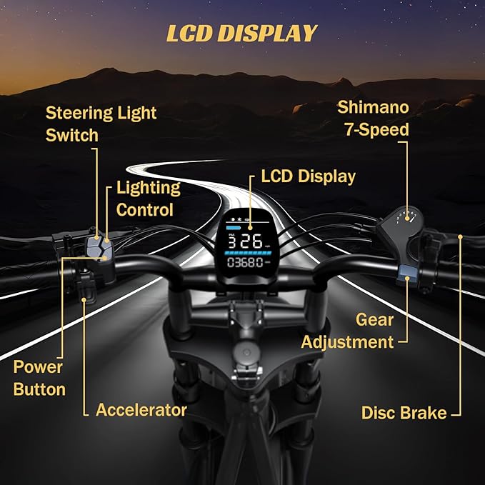 - Adaptive Riding Modes: Switch between pure electric, pedal-assist, or manual modes on this fat tire ebike. Shimano 7-speed gears and enhanced dual suspension (frame + seat) optimize comfort across city streets or mountain trails