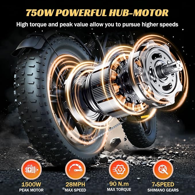 - High-Powered Performance: This electric bike for adults packs a 1500W peak motor with 90N.M torque, effortlessly conquering 35-degree slopes for true electric dirt bike adventures. The 20×4.0-inch fat tires provide superior traction on sand, mountains, or snow, while app-enabled speeds up to 28MPH deliver thrilling rides.The extended seat with integrated rear rack (50lb capacity) ensures comfort and utility on long journeys
