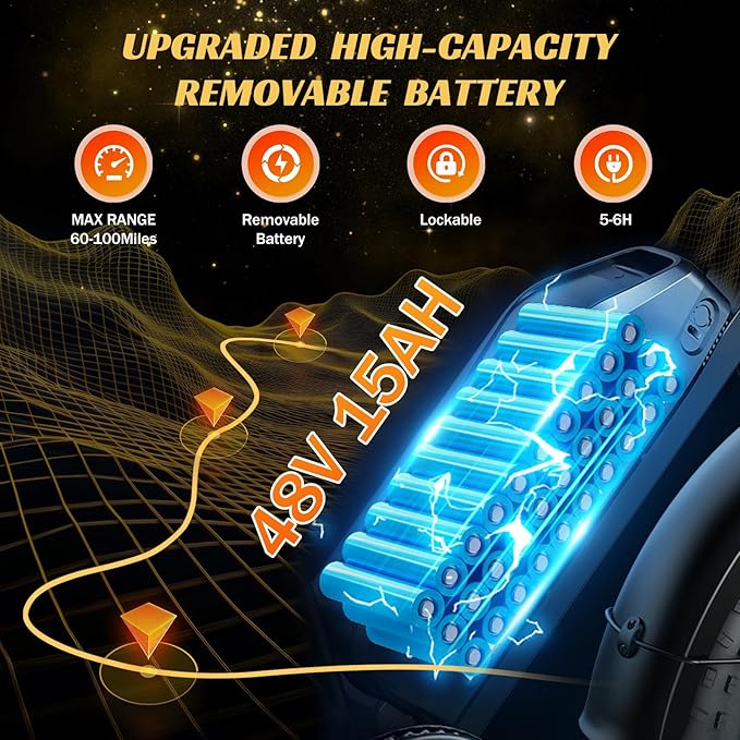- Smart Battery System: Featuring a waterproof 48V/15AH removable battery, this adult electric bicycle delivers 50+ miles per charge with energy-saving tech. Recharges in 5 hours—perfect for commutes or off-grid explorations