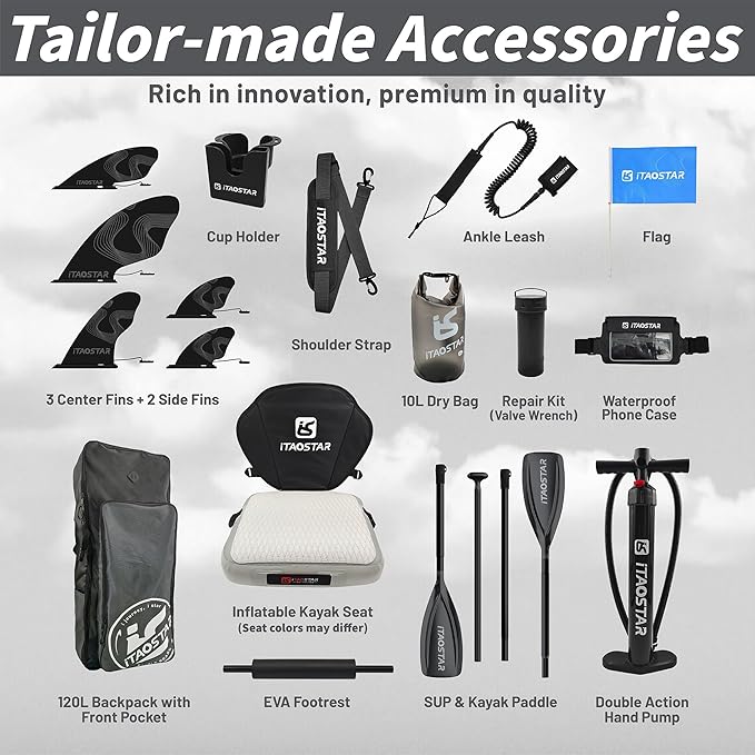 - Tailored One-Stop Accessories - Our iSUP set features more stuff than others, which include an adjustable paddle with kayak kit, 5 fins, seat, footrest, double-action pump, shoulder strap, ankle leash, waterproof pouch, 120L backpack, 10L dry bag, cup holder, flag, valve wrench, and manual