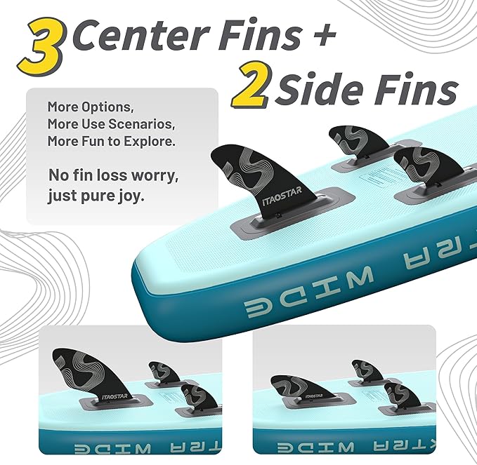 - More Fun - Exclusively from iTAOSTAR, our five tailored fins (3 central + 2 side fins) adapt to various scenrios, offering diverse balance and zero fin-loss worries. Dive into personalized paddleboarding fun without limits