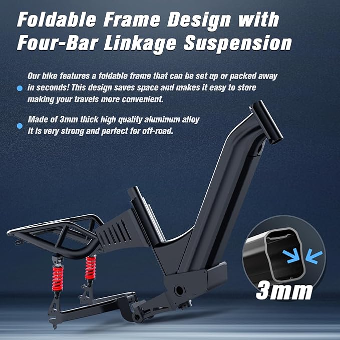 - 【𝟑𝐦𝐦 𝐓𝐡𝐢𝐜𝐤 𝐀𝐥𝐮𝐦𝐢𝐧𝐮𝐦-𝐀𝐥𝐥𝐨𝐲 𝐅𝐫𝐚𝐦𝐞】The 3mm (others: only 1 or 1.5mm) thickened airplane-level aluminum-alloy frame ensures a safe ride for up to 400lb riders. Sturdy and Rustless frame ensures this ebike a longer liefespan and it can accompany you to any place you want to go!