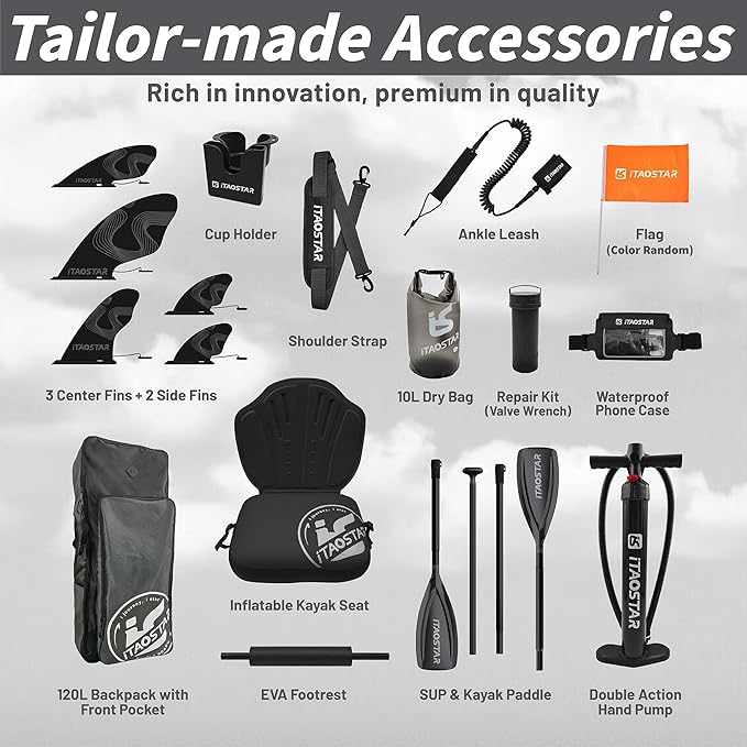 - Tailored One-Stop Accessories - Our iSUP set features more stuff than others, which include an adjustable paddle with kayak kit, 5 fins, seat, footrest, double-action pump, shoulder strap, ankle leash, waterproof cell waist bag, 120L backpack, 10L dry bag, cup holder, flag, whistle, valve wrench, and manual