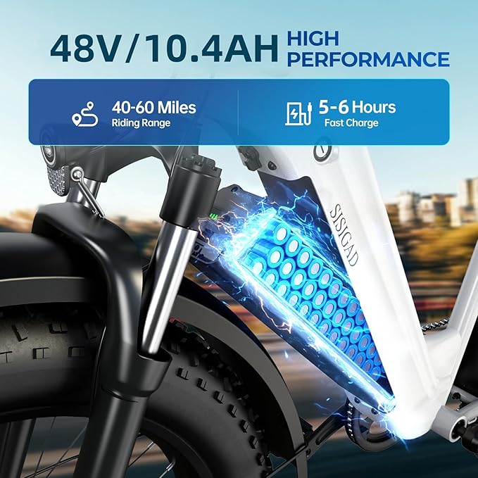 - 【Ergonomics Shock and Absorption System】: The fast electric bike has an adjustable front suspension and dual disc brakes: equipped with 2 front fork spring shock absorbers and 2 puncture-proof 26''*4.0" electric bike fat tires have better wear resistance, strong grip and anti-slip effect, suitable for any road conditions, including sand, snow, gravel roads and mountain roads. The bicicleta eléctrica has a good off-road experience