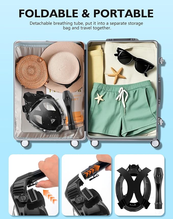 - 【FOLDABLE & COMFORTABLE TO WEAR】- This full face snorkeling mask has a foldable design, and the snorkel can be easily removed and put into the storage mesh bag, which is convenient for storage and travelling. The skirt is made of a large area of food-grade liquid silicone, environmentally friendly and odourless, and it is soft and comfortable to fit the facial contour perfectly, long time wearing won't bring you pressure, so you can easily enjoy the infinite fun of diving.