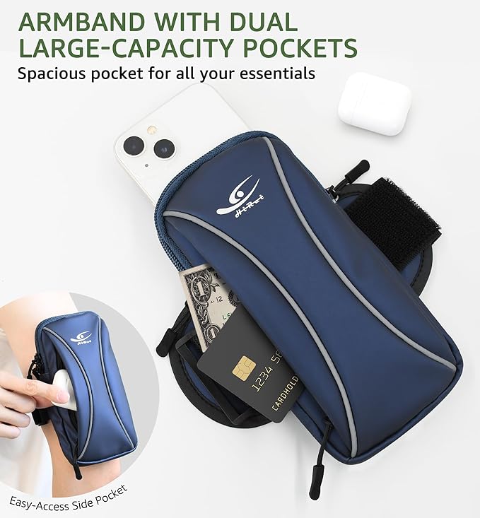 HiRui Arm Bag & Wrist Bag Phone Holder, Sports Running Armband for Gym, Cycling & Workout, Compatible with iPhone 16/15/14 Series, Samsung Galaxy & More, Reflective, Adjustable, Secure Fit (Blue)