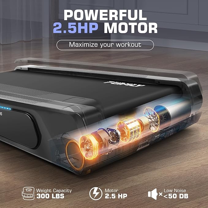 - 【Hidden 2.5HP Motor Design】Our walking pad features a concealed 2.5HP motor within the running belt, maximizing your running space and ensuring safety during high-speed workouts. The advanced motor technology enhances durability, stability, and energy efficiency while minimizing noise.