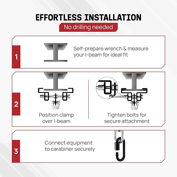 - EASY INSTALLATION SAVES TIME & EFFORT: One-piece construction allows for quick & straightforward punching bag installation in minutes; Simple clamping mechanism minimizes drilling & ceiling damage, the I-beam mount can blend seamlessly with your existing home structure