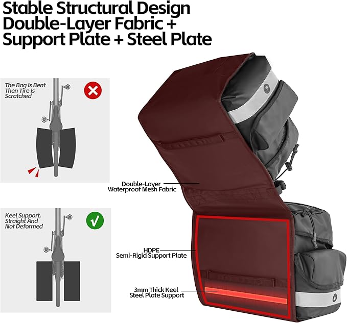 - Stable structural design, double layer fabric + support plate + steel plate on two sides, which can effectively prevent the bag from bending and deforming, ensure excellent tear resistance and wear resistance, meet the needs of long distance load bearing riding.