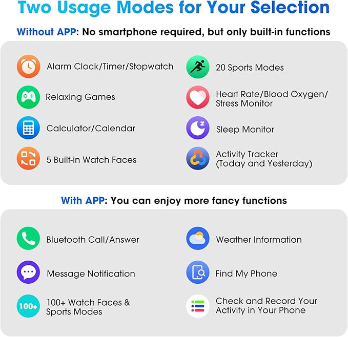 - No APP & Phone Required Pedometer Watch: The pedometer watch can be used seperately without APP or smartphone connections! It's easy to enjoy features like pedometer, stop watch and so on. Perfect for anyone looking for an easy fitness tracker without the hassle of smartphone setups.