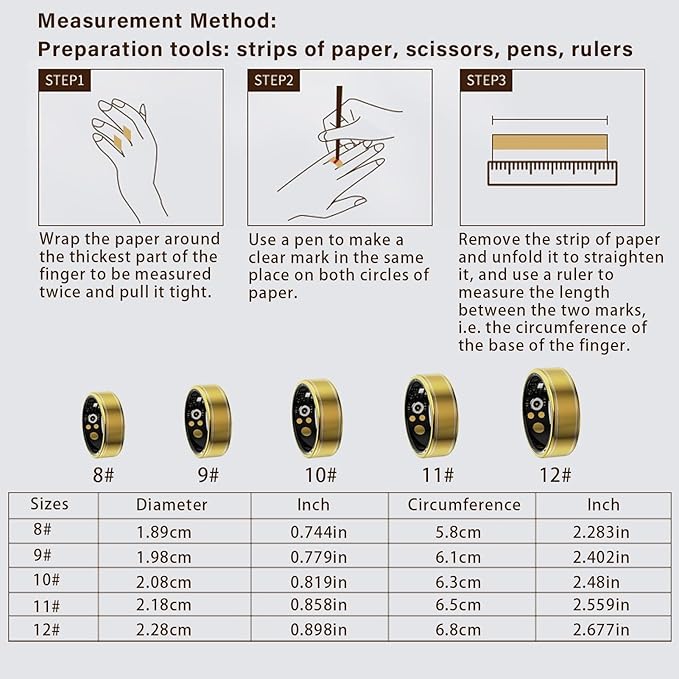 - 【Select the Right Size】: Measure your finger circumference using our size guide to ensure the best fit. The Anarow smart health ring is available in 8 sizes. If your measurement is between sizes, we recommend choosing the larger size for added comfort and accurate sensor performance