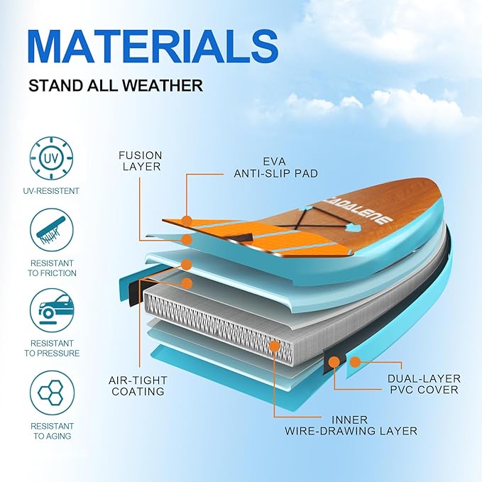 - 【SLIP-RESISTANT DESIGN & SAFETY ROPES】- Crafted with heat-welded PVC and dual-layer drop-stitch technology, this SUP board ensures high pressure resistance without deformation. Non-slip deck enhances safety for all skill levels, minimizing injury risks during falls. It provides better grip in water sports and performs excellently in rivers, lakes or oceans. The upgraded cross safety rope helps keep the wrap in place during surfing or fishing.