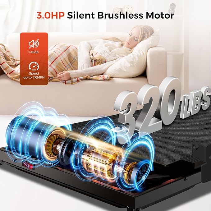 - 【Comfortable Running Experience】Equipped with a 3.0 HP silent brush-less motor, with a maximum load of 320 pounds. Even when used during family rest, it will not cause interference and create a quiet and comfortable exercise environment for you. The speed range is from 0.6-7.6 MPH, and you can choose different running speeds according to your needs to achieve the best sports experience.