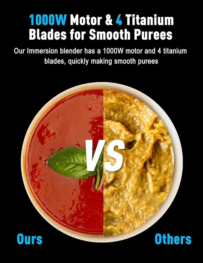 - 【4-Blade Titanium Head】Our immersion blender features a 4-blade titanium head for superior performance. Compared to standard 2-blade designs, it blends more efficiently, This cutting-edge design not only improves blending efficiency but also extends the lifespan of the blades, making it a reliable choice for all your culinary needs.