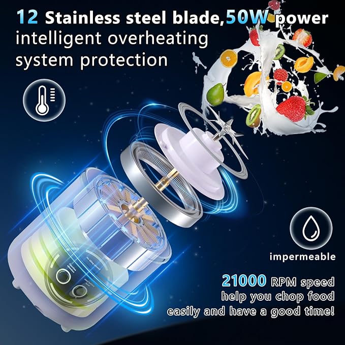 - Versatility:Mini mixer is equipped with 12 sharp stainless steel blades with a speed of 21000 revolutions per minute, which can quickly chop fruit (watermelon, mango, kiwi, strawberry) and vegetables and prepare nutritious milkshakes and smoothies in Within 10-15 seconds;Comes with a special travel lid, can interchange with the cutter base and work as a drinking bottle