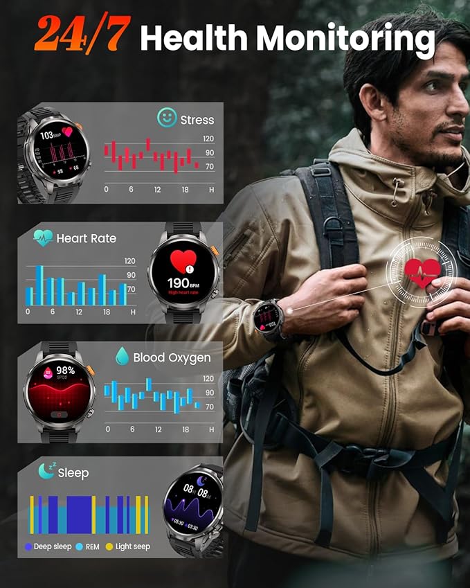 - 【24/7 Health & Fitness Monitoring】 This smartwatch for men uses high-precision sensors to track your heart rate, blood oxygen, sleep quality, and stress levels in real time. The companion app provides detailed sleep analysis (light, deep, and awake stages) and health insights to help you optimize your lifestyle. (Note: Not intended for medical use.)
