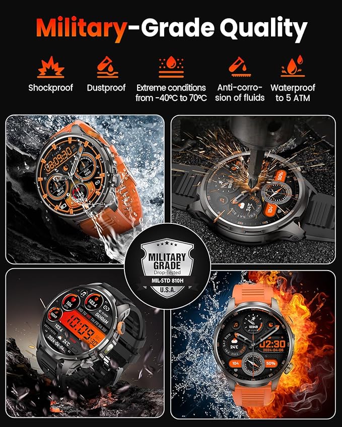 - 【Built for Unmatched Toughness】 This rugged smartwatch for men features a durable full-zinc alloy casing designed to resist scratches, handle extreme temperatures, and perform in the toughest environments. Whether you're trekking through rough terrain, working in harsh conditions, or exploring the outdoors, this watch is your dependable partner—ready to take on every challenge with you.