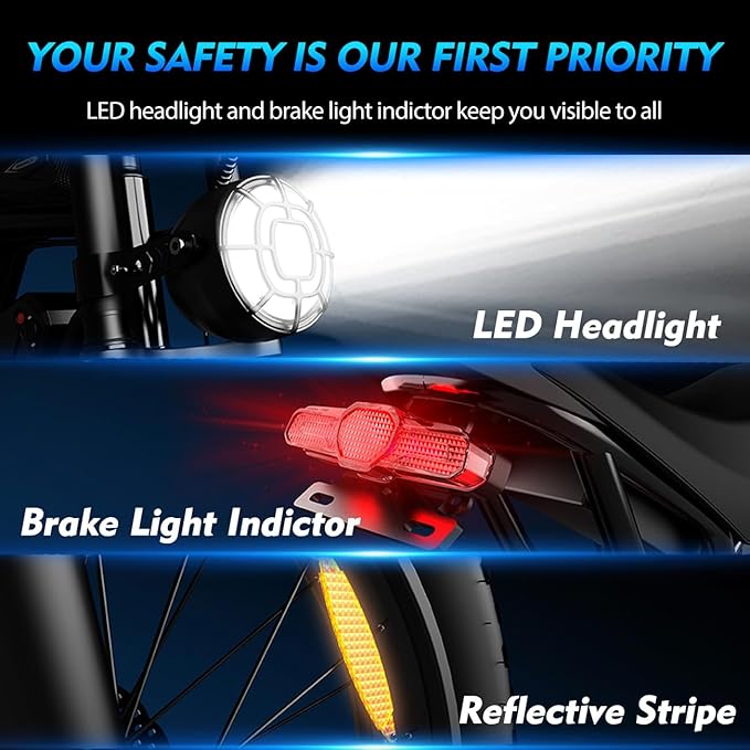- Conquer Any Terrain – Shamano’s 7-speed system shifts smoothly to match your path: low gears tackle steep climbs with ease, high gears let you fly on flat stretches. Fat Tire E Bike paired with 20x4.0 all-terrain tires, which grip tight on wet pavement, muddy trails, or dry dirt, this bike adapts in seconds—so you can switch from city streets to forest paths without missing a beat