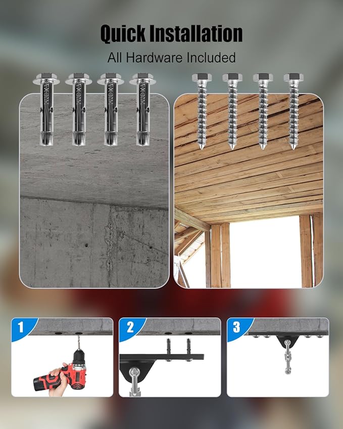 - Quick Installation: Comes with all the necessary hardware: expansion bolts for concrete and wood screws for beams. Just pre-drill four holes and fasten the mount securely—installation takes minutes. One-piece molded design with no welding points adds extra durability and peace of mind