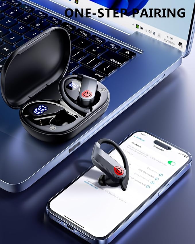 - Bluetooth Earbuds over ear 120h Playtime & Led Power Display: Outlast competitors with 120-hour wireless over the ear earbuds. The digital-display charging case shows exact battery levels—twice the enduranceof ordinary over ear buds. Never miss a beat during marathons or workdays.