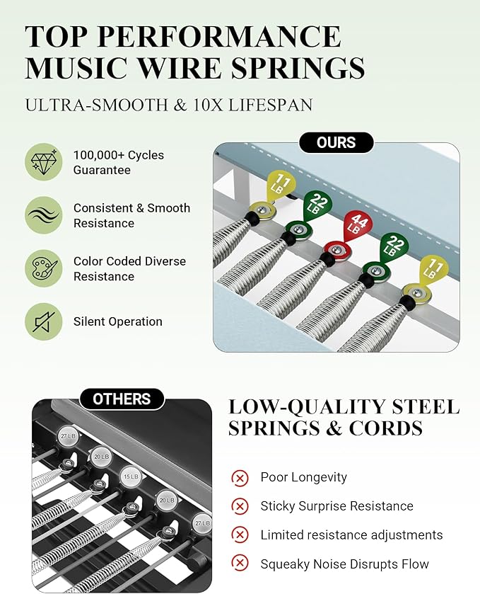- Luxury Resistance Springs for a Flawless Flow: Indulge in the sublime smoothness of professional music wire springs, engineered for over 100,000 flawless motions. Say goodbye to cheap, inconsistent alternatives—our reformer pilates machine delivers buttery-smooth tension and lasting reliability, making every movement pure pleasure.